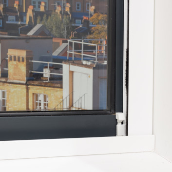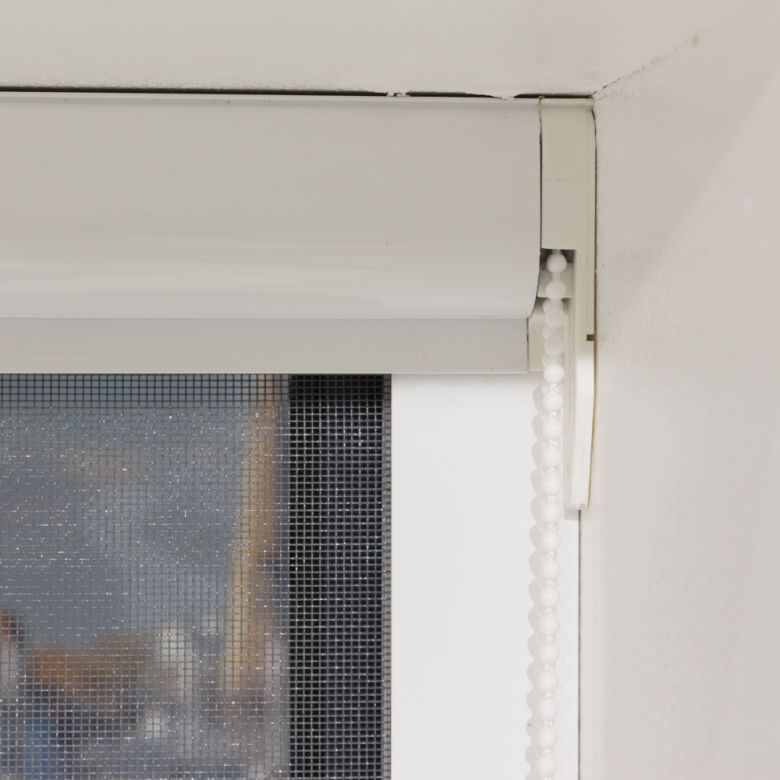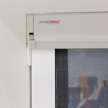 The YewdaleDefiant® F30 retractable insect screen with sidewinder operation as manufactured by Yewdale. Roll-up flame retardant, rot-proof PVC coated fibreglass mesh within white powder-coated aluminium cassette, guide channels and bottom bar. Supported by sturdy metal brackets and incorporating plastic control chain.